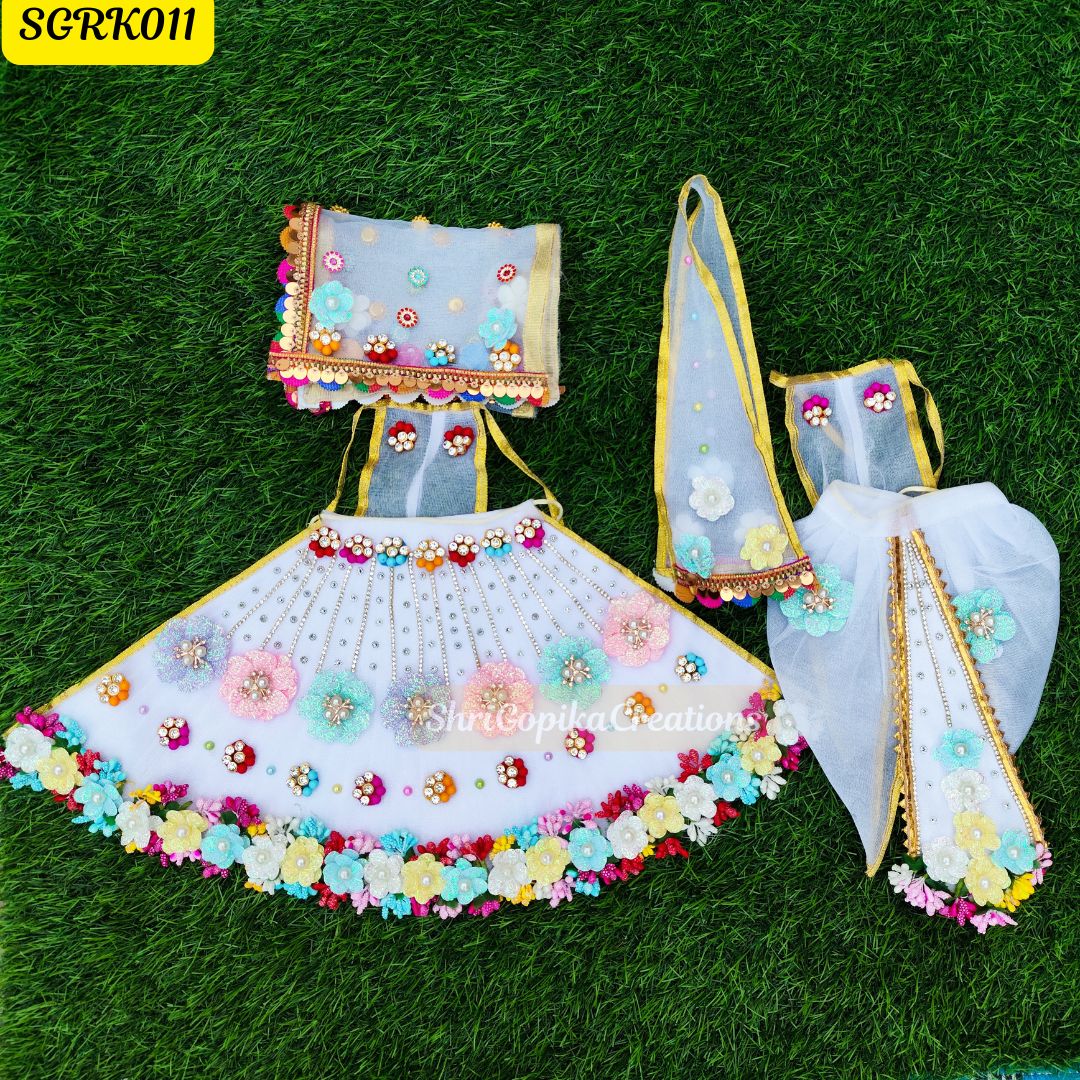 Enhance the divine beauty of your Radha Krishna idols with this white net with Vibrant Multicolor outfit, featuring intricate golden embroidery and handcrafted floral embellishments. The rich fabric and elegant design make it perfect for special occasions and daily worship.